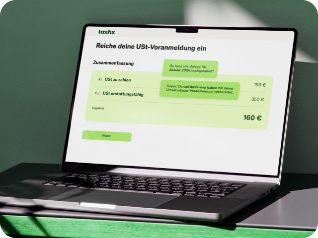 Jetzt loslegenWenn du selbständig und umatzsteuerpflichtig bist, kannst du deine Steuer bequem mit Taxfix USt Essentials erledigen. Du bist Kleinunternehmer*in und möchtest auch Taxfix nutzen? Dann haben wir hier eine spezielle Lösung für dich: Taxfix für Kleinunternehmer*innen.